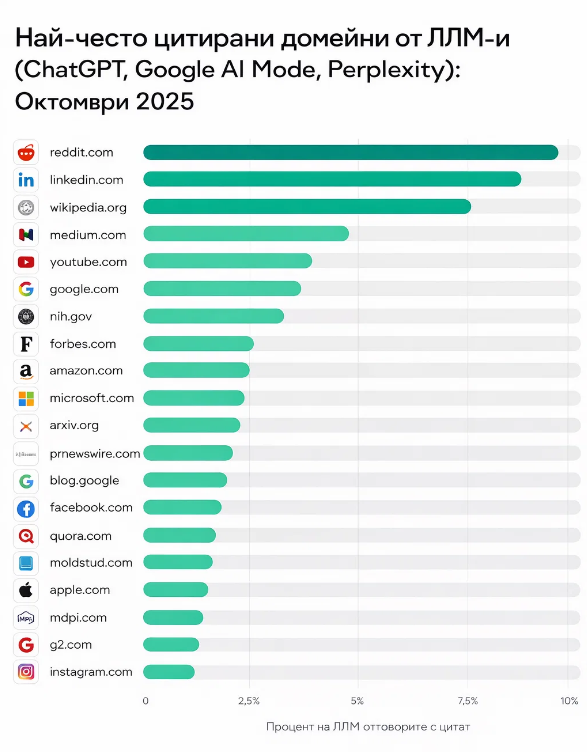 Особено Reddit заема огромен дял в AI цитиранията.
